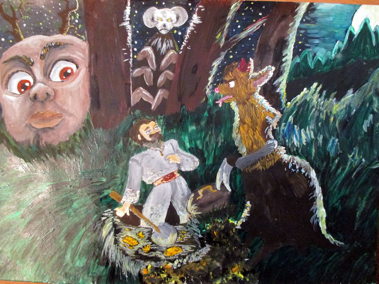 Обрадовался старик. На этот раз у него был с собой заступ. С его помощью он убрал со старой могилы огромный камень. Только хотел отдохнуть, да табачку нюхнуть, как сверху кто-то чихать начал. Испугался дед, табак убрал, но от дела своего не отступил. Стал копать землю да сам с собой разговаривать. Только каждое слово будто кто-то эхом за ним повторял. Да не одним голосом, а разными. Мерещилась старику нечисть всякая: