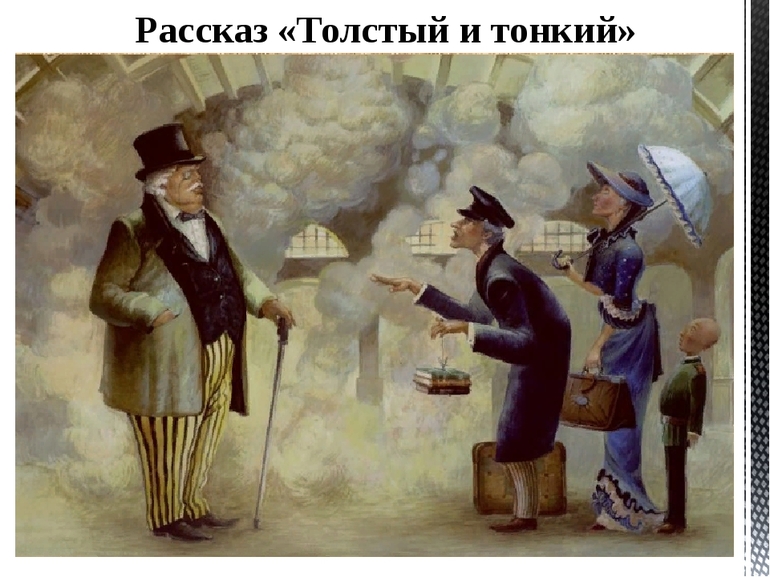 В рассказе «Толстый и тонкий» характеристика героев строится от обратного. Верха, в большинстве своем, настроены прогрессивно и демократично, но изменению социальных отношений противится средний слой общества, не достигший, но надеющийся достичь, определенных высот и привилегий, гарантированных значимым чином.
