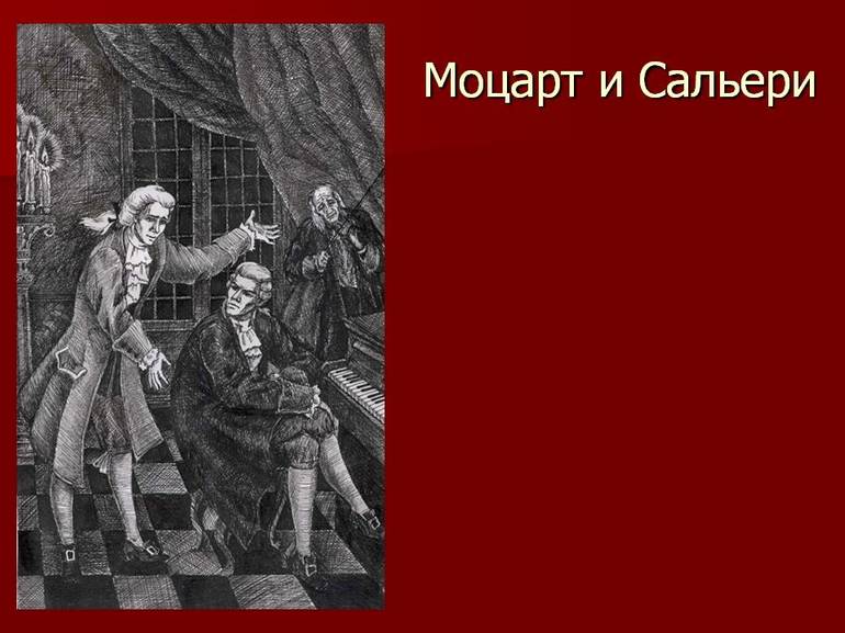 - Начало трагедии А. С. Пушкина приходится на монологи-размышления Сальери, так же как и конец.