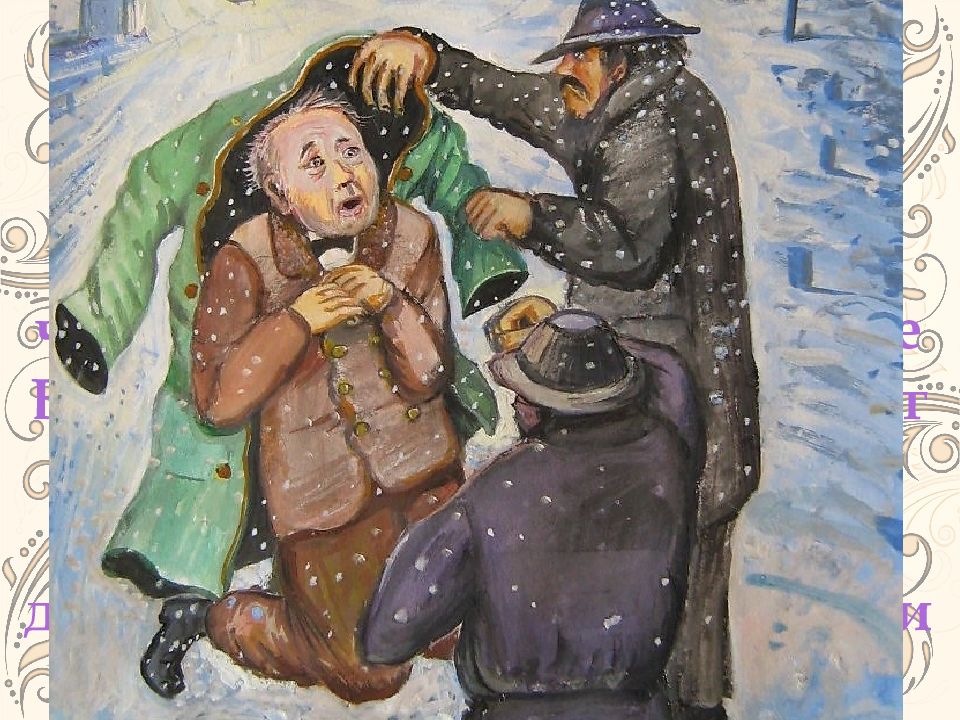 В повести «Шинель» Н. Гоголя сначала отчетливо прослеживается издевательство и унижение Акакия Башмачкина со стороны сослуживцев. Мужчина не может дать отпор и не реагирует на дурные шутки. Приближаясь к заветной цели — покупке новой шинели, Акакий откладывает средства, отказывая себе во всем. Впоследствии бесчеловечный поступок вора рушит все надежды. Шинель украдена, но Башмачкин борется за свою вещь, обращаясь к знакомым за помощью.