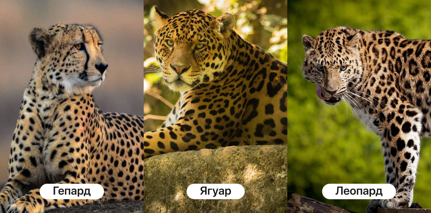 На фото, в зарослях травы, ягуара, гепарда и леопарда идентифицировать трудно. Но эти животные не только относятся к разным биологическим подсемействам, у них к тому же различные поведенческие привычки и места проживания. Похожи они только пятнами на шкуре и рационом – эти хищники любят свежую дичь, однако способ охоты у каждого свой. Познакомившись с анатомическими особенностями и внешними различиями, отличить одного зверя от другого будет легко, даже на картинке.